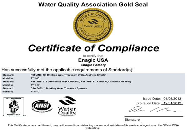 Water Quality Association (WQA)的金印認證項目為美國國家標準學會 (ANSI) 和加拿大標準委員會(SCC)授權和認可,針對國際權威如NSF/ANSI、CSA、ASME等相關產品進行測試和認證。