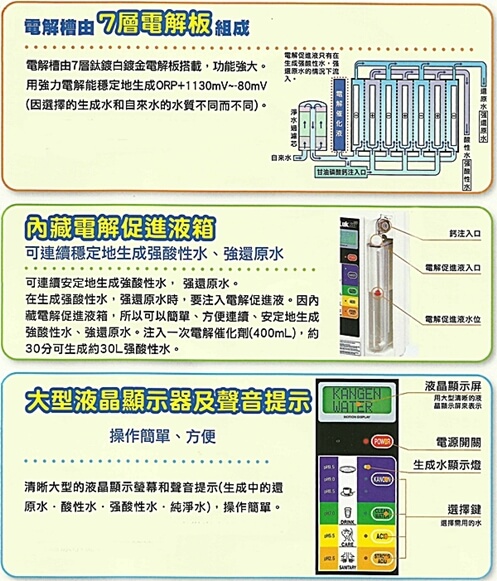 ![]() 讓您每天的飯菜更好吃 去除黃綠蔬菜中較重的澀味 料理 煮飯 泡茶、沖咖啡 酒及威士忌等的調酒水 與酸性較強的食物一同飲用 身體保健及預防醫學 ![]() 用於服藥和沖泡奶粉 ![]() 能夠使皮膚形成弱性,健康形的美容水 作為收歛性的化妝水 用於煮麵和烹調油炸食物類的麵粉糊 ![]() 水可以消毒也是你保護衛生環境的好幫手 菜刀、砧板和毛巾等的洗滌與殺菌 個人衛生、家居消毒及清洗醫療器具 ![]() 洗滌效果最佳的水 清洗厨房的油垢 洗蔬菜及魚肉 淨化環境 清除斑漬 洗滌時可以減少洗條劑 |